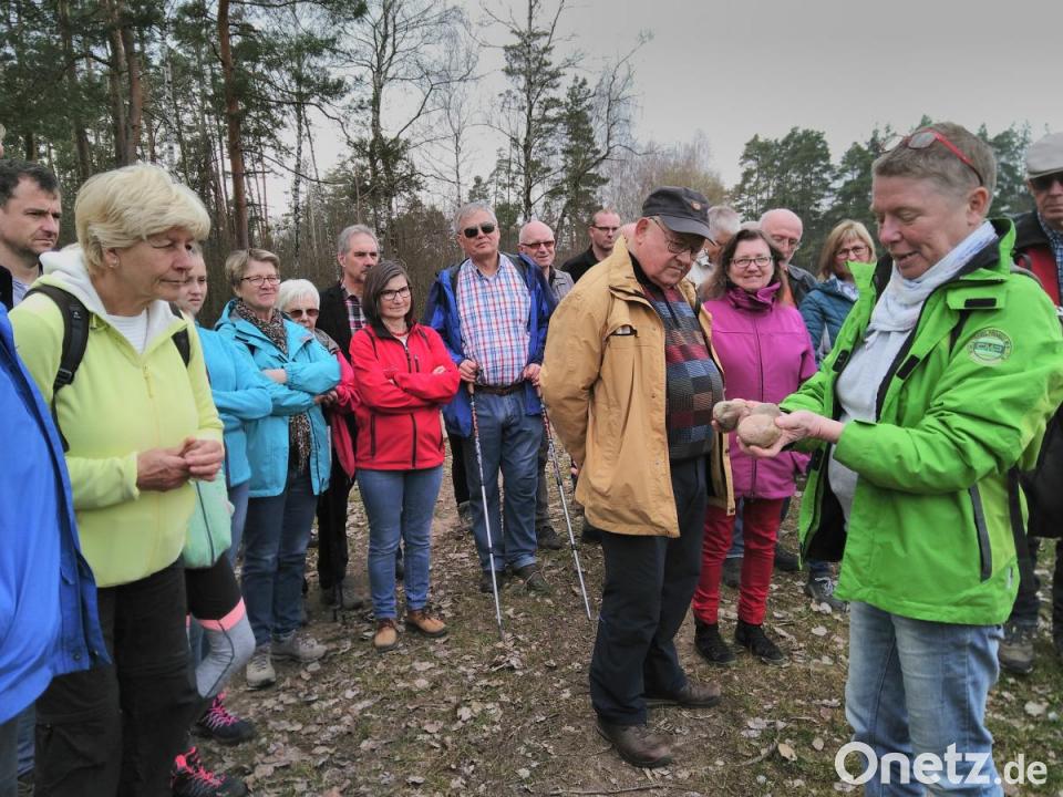 Wirsing wies immer wieder auf interessante Gesteinsschichten hin und zeigte auch die knollenartigen Quarzgerölle der Schotterterrassen. Diese verdanke man dem Variszischen Gebirge, das vor 320 bis 290 Millionen entstanden sei (Perm), sagte sie. "Auf der Erde geht nichts verloren, es ändert nur seine Form", lernten die Teilnehmer in der Pegmatit-Sandgrube im Schützenholz. Dieser universelle Rohstoff kann dort aber nur noch voraussichtlich 30 Jahre lang abgebaut werden, dann ist die Lagerstätte erschöpft. Interessiert betrachteten die Wanderer dort auch die färbenden Mineralschichten, die malerische Muster in die Hänge zeichneten.