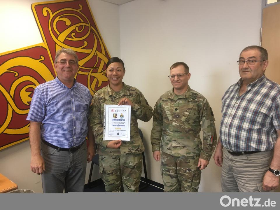 (nbu) Bei der Quartalsbesprechung zwischen der 18. CSSB, der Reservistenkameradschaft Freihung und dem Markt Freihung händigte Bürgermeister und RK-Chef Norbert Bücherl im Beisein von Lieutenant Colonel Jonathan Meisel an Command Sergeant Major Muriel MacDonald die Urkunde der Kreisgruppe Oberpfalz-Mitte für ihre erfolgreiche Teilnahme am Leistungsmarsch in Freihung aus. Der Leistungsmarsch ist eine notwendige Disziplin, um das Leistungsabzeichen der Bundeswehr zu erlangen.