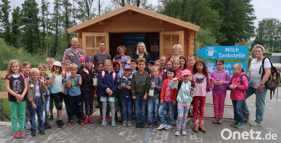 Endlich ging es zur Hauptattraktion, der Milchtankstelle, die täglich aus einem großen Edelstahltank gespeist wird. Konrad Reil erläuterte den Kindern, wie der Automat bedient wird, aus dem rund um die Uhr frische Rohmilch gezapft werden kann. Anhand der dort zu lesenden Beschreibung ist dieser Vorgang für jeden Kunden kinderleicht. Dort ist auch zu lesen, wie weiter mit dem Lebensmittel umgegangen werden muss. Jedes der Kinder wollte als erstes eine Ein-Euro-Münze hineinwerfen, um dafür einen Liter Milch in die Glasflasche fließen zu lassen. Wer will, kann sich am Automaten nebenan eine nagelneue, vorgekühlte Flasche kaufen. Dort werden auch Eier angeboten.