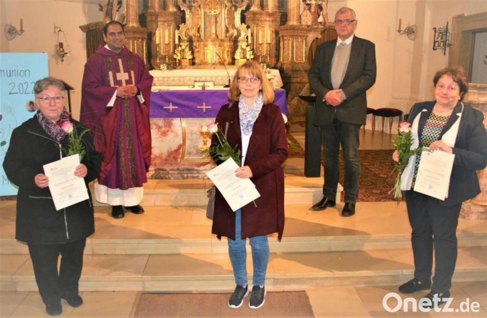 Als Zeichen der Wertschätzung überreichten sie Gutscheine, Rosen und Dankurkunden. Die Kirchgänger würdigten die Arbeit der drei Geehrten mit einem kräftigen Applaus.