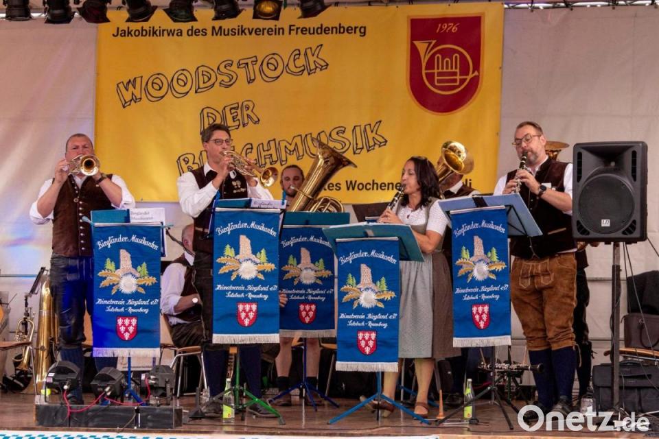 "Woodstock der Blechmusik" nennt der Musikverein die Jakobikirwa in Freudenberg auch. Der Titel ist in Anlehnung an ein großes Festival in Österreich entstanden, das im Juni rund 80.000 Besucher angelockt hat. Klar – so viele Leute sind nicht auf den Jakobiplatz gekommen, doch ein interessantes Programm für Blasmusikfreunde gab es trotzdem. Jedes Jahr versucht der Musikverein, bekannte Ensembles aus der Oberpfalz zu engagieren, und das ist heuer zweifelsohne wieder gelungen. Am Samstag ließen die Alfelder und die Birgländer Musikanten traditionelle Oberpfälzer Stücke erklingen – etliche schöne Bairische (Zwiefache) waren dabei, die man kaum noch auf den Tanzböden hört, weil sie von der Retorten-Musik verdrängt werden.