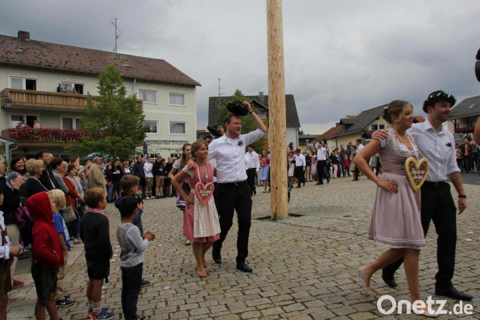 Höhepunkt am Sonntag war das Baumaustanzen auf dem Dorfplatz, zu dem sich trotz des drohenden Regens viele Besucher einfanden. Die Kirwaburschen hatten 18 Gstanzln gedichtet, mit denen sie einen amüsanten Einblick in das Dorfgeschehen gaben. Die Hammerbachthaler Blousn spielte dazu zünftig auf. Kaum waren die Gstanzln gesungen, setzte der Regen ein und das Kirwageschehen verlagerte sich ins Festzelt, wo die Hammerbachthaler mit uriger Kirwa- und Wirtshausmusik für gemütliche Unterhaltung sorgte. Abends wurde die Blousn von der Band Rundumadum abgelöst, die ein bunt gemischtes musikalisches Repertoire im Gepäck hatte.