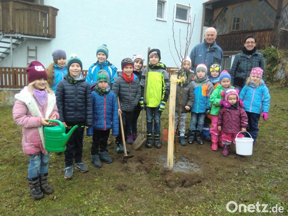 Zum Dank für ihre Teilnahme an den Aktionen auf der Streuobstwiese hatte nämlich jedes der 23 Kinder einen Obstbaum für den eigenen Garten geschenkt bekommen. Zusammen mit Wühlmauskorb und Pfahl lieferten Vertreter des Vereins die Wunschbäumchen, darunter Apfel und Birne, zum Großteil aber Kirsch- und Zwetschgenbäume. Oft noch am gleichen Tag setzten sie ihren Obstbaum in das Pflanzloch im eigenen Garten.