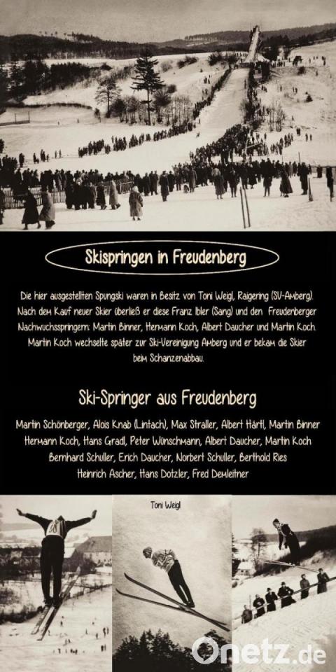 Die historischen Sprungski stammen eigentlich von Toni Weigl, Raigering (SV Amberg). Nach dem Kauf neuer Skier überließ er diese Franz Ibler (Sang) und den Freudenberger Nachwuchsspringern Martin Binner, Hermann Koch, Albert Daucher und Martin Koch. Koch wechselte später zur Ski-Vereinigung Amberg und bekam die Skier beim Schanzenabbau.