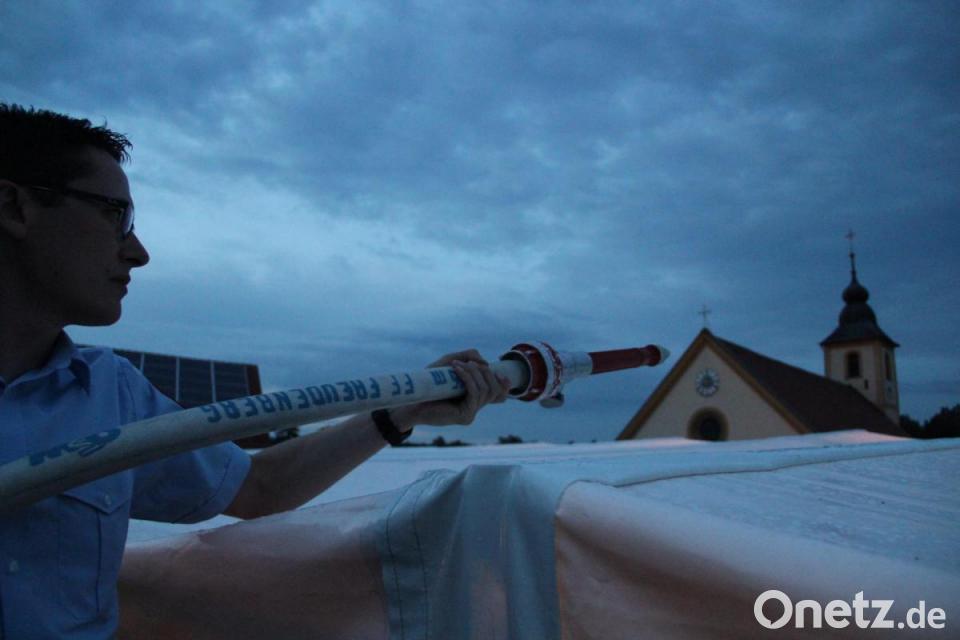 Um 21.40 Uhr öffnet die Feuerwehr die Schleusen für den Gewitterregen.