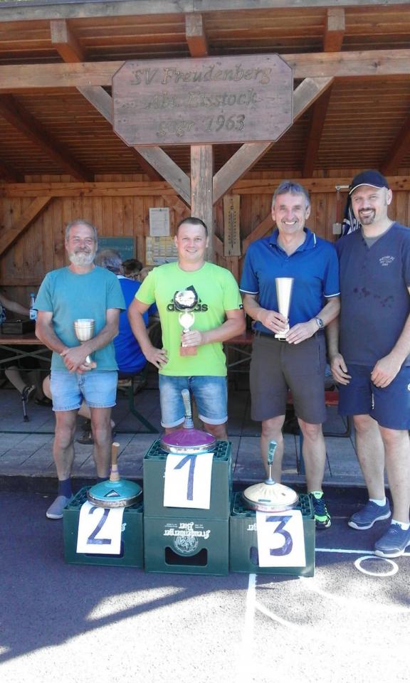 (anh) Michael Zimmermann (Zweiter von links) aus Wutschdorf sicherte sich damit die Vereinsmeisterschaft der Eisstockschützen des SV Freudenberg. Hinter ihm landeten Rainer Brunner (links, 109) und Erich Daucher (Zweiter von rechts, 108). Abteilungsleiter Werner Augsberger (rechts) konnte insgesamt 15 Teilnehmer begrüßen. Die Freudenberger Eisstockschützen treffen sich jeden Donnerstag um 18 Uhr auf der Asphaltbahn unterhalb des Freibads. Interessierte sind jederzeit willkommen, Vereinsstöcke sind vorhanden.