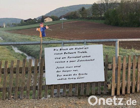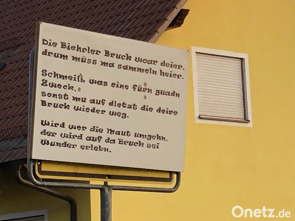 Ob da aber wirklich alle brav ihre Maut bezahlt haben? Eingefordert wurde diese Abgabe jedenfalls im Ortsteil Bühl, auf einer Tafel, die Unbekannte nachts übers Ortsschild gestülpt hatten: "Die Biehrler Bruck woar deier, drum müss ma sammeln heier. Schmeiß was eine fürn guaden Zweck, sonst mu auf dletzt die deire Bruck wieder weg" hieß es da flott gereimt.