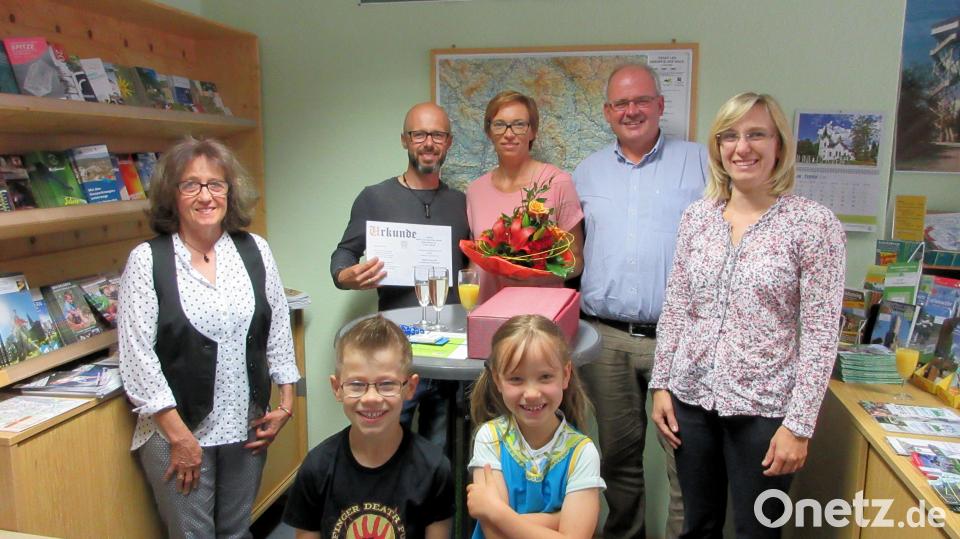 (bsc) Zum 25. Mal verbringen sie ihren Urlaub im Erholungsort. Bürgermeister Gottfried Härtl und Fremdenverkehrsamtsleiterin Melanie Höfer würdigten das Jubiläum bei einer Feierstunde im Tourist-Info. In der Laudatio dankten sie den treuen Gästen und überreichten Geschenke, Urkunden und Blumen. Für Sohn Niko hatte Melanie Höfer ein Entdeckerbuch Natur mit Entdeckerlupe und Farbstiften parat. Jan Schulz kam früher mit seinen Eltern nach Friedenfels, mittlerweile reist er jedoch mit Frau und Kind alljährlich in den Erholungsort. Das weite Wanderwegenetz des Naturparks Steinwalds, die umliegenden Orte sowie den Ochsenkopf und das Waldnaabtal schätzen die treuen Gäste besonders. Auch das Friedenfelser Freibad sowie die Freibäder der nachbarorte haben die Gäste schon oft besucht. Durch die stete Wiederkehr kennen mittlerweile auch die Laden- und Gaststättenbesitzer die treuen Gäste. Die alljährlich nette Begrüßung und Erinnerung an die Urlauber vom Vorjahr, freut die Familie Schulz sehr. Miterlebt hat Jan Schulz auch die Schließung der Gaststätten im Erholungsort. "Im Cafe Roseck waren wir früher oft vertreten". Auch Quartiergeberin Zita Schuster dankte ihren Gästen für die Treue und wird nach der Ankündigung des Ehepaars, im nächsten Jahr kommen wir im Herbst, die Erlebniswochen Fisch des Landkreises Tirschenreuth näher bringen.