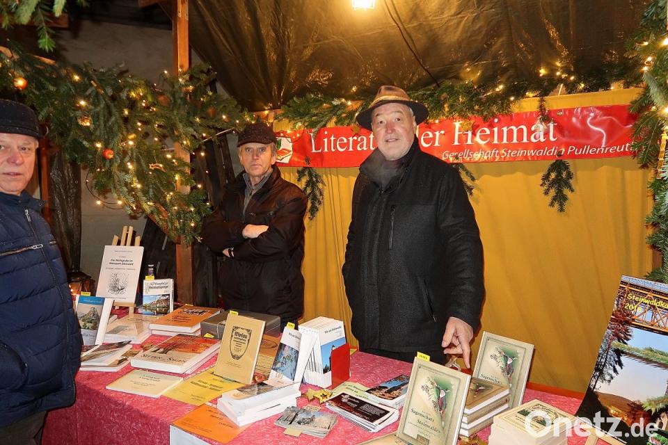 Am Samstag und Sonntag strahlen wieder unendlich viele Lichter im und rund um den historischen Ökonomiehof mit 44 Verkaufsständen. Mit dabei ist die Gesellschaft „Steinwaldia“ Pullenreuth. Im Vorjahr freuten sich (von links) Erwin Becher, Josef Busch und Norbert Reger über das rege Interesse an Büchern und Heimatliteratur.