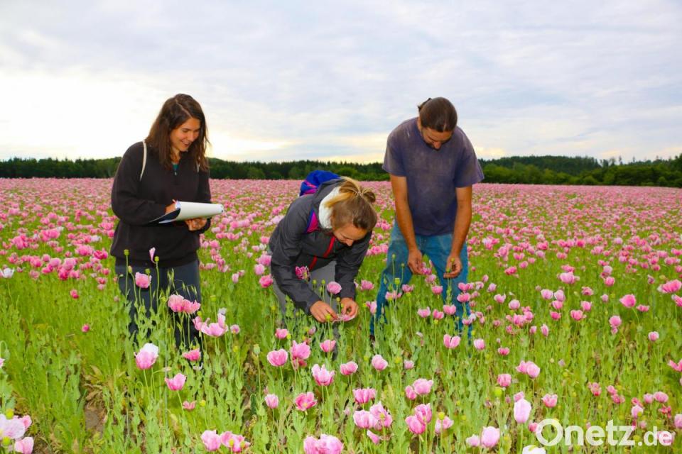 Im Rahmen eines Forschungsprojekts untersuchten nun Wissenschaftlerinnen das Insektenvorkommen auf den weithin leuchtenden Feldern. Mohn-Pionier und Bio-Bauer Josef Schmidt begleitete dazu die Studentinnen Rosa Albrecht und Mareen Geyer zu den prächtig blühenden Feldern und unterstützte sie bei ihren Arbeiten. „Das Artensterben hat einen Anteil daran, dass nach Alternativen gesucht wird“, weiß Josef Schmidt und verweist darauf, dass derzeit nur noch wenig in freier Natur blüht.