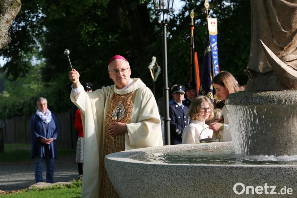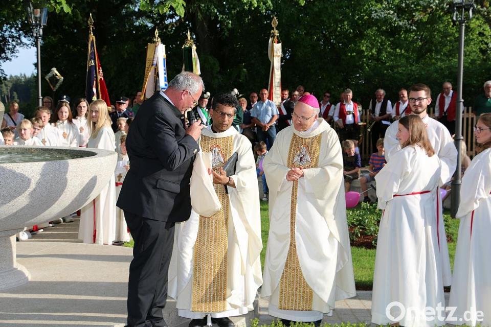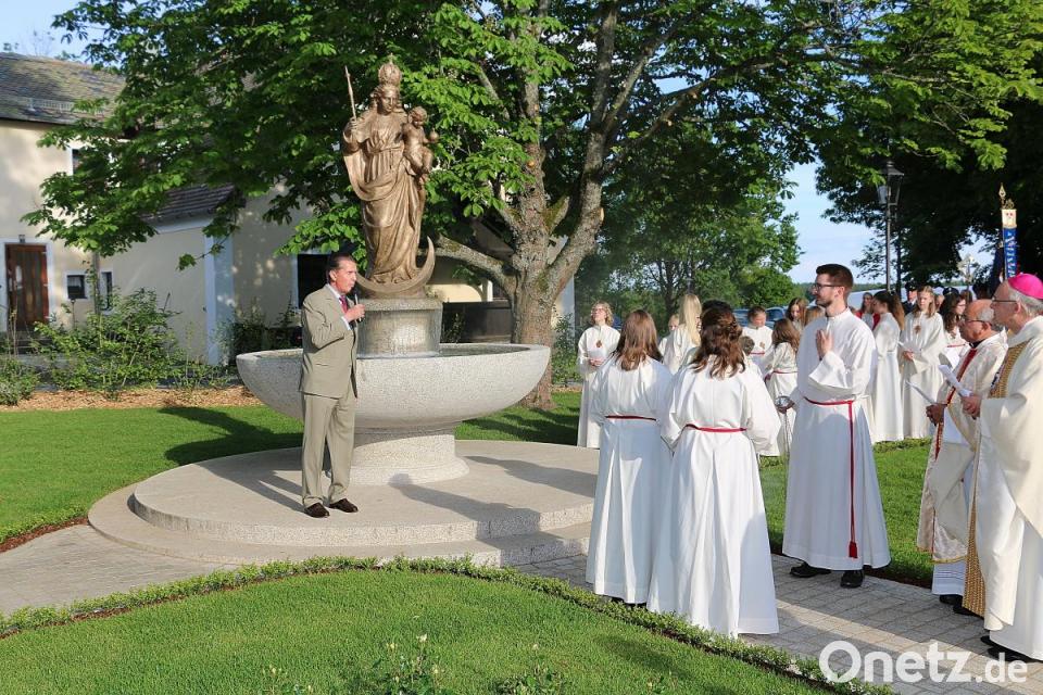 Zu diesem Taufbrunnen komme nun ein Dorfbrunnen. "Ich kann der Familie und dem Jubilar für ihr großzügiges Engagement nur danken", sagte der Bischof. Er erinnerte an die frühere Bedeutung eines Brunnens. "Wichtige Szenen und Gespräche spielten sich am Brunnen auch in der Bibel ab." Für Schmunzeln sorgte der Geistliche in der prall gefüllten Kirche, als er sich mit Lob für die gestaltete Brunnenfigur an den anwesenden Künstler Engelbert Süß wandte; "Ihre Patrona Bavariae kann mit der Münchener Figur auf dem Marienplatz mithalten. Sie ist die Mitte Bayerns und jetzt habt ihr die Mitte in Friedenfels." In einem abschließenden Gebet sagte der Bischof: "Heilige Gottesmutter, Patronin dieser Kirche und Krönung des neuen Brunnens, bitte für uns, Amen."