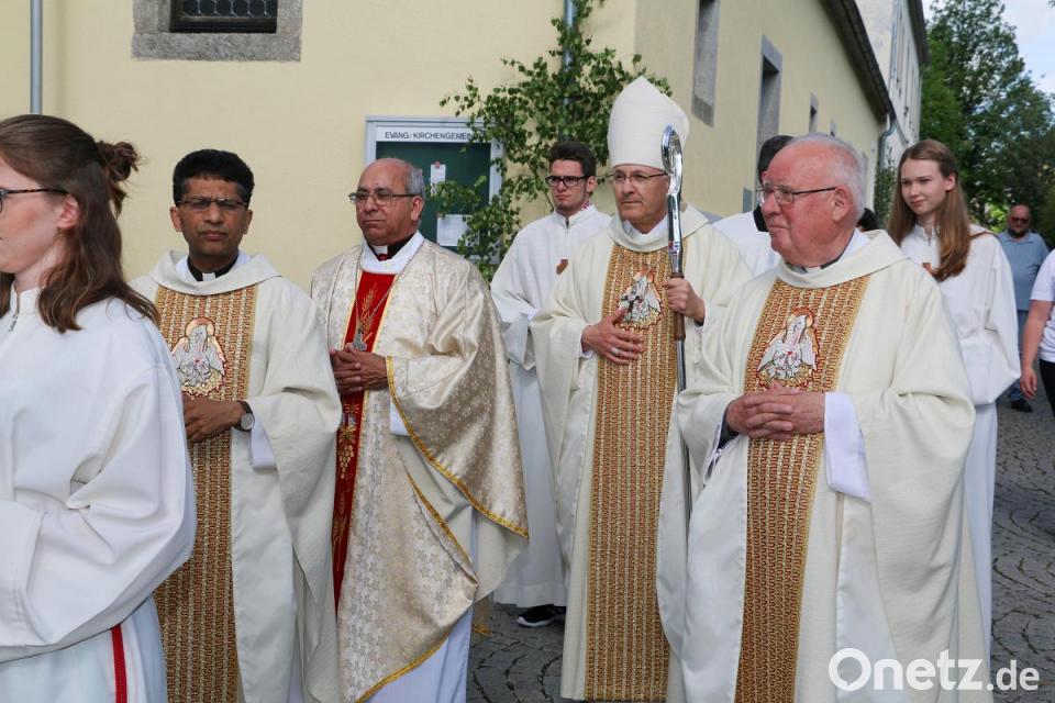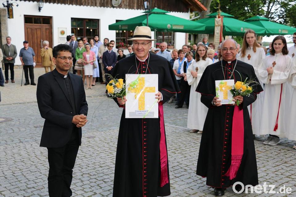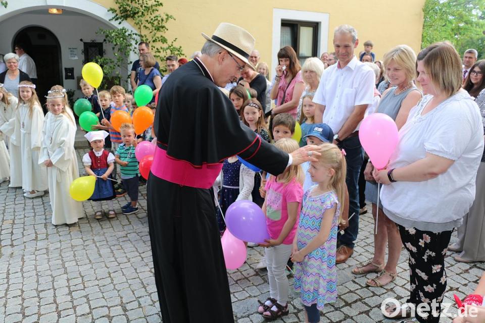Obwohl es das Protokoll bei der Begrüßung am Pfarrhof nicht vorsah, meinte der Bischof: "Wir müssen gleich zur Kirche, doch ich möchte vorher noch die vielen Kinder segnen." Jedem einzelnen legte er dabei die Hand auf, hatte vor allem für die ganz Kleinen aus dem Kinderhaus noch nette Worte und einen Händedruck parat. Gefallen fand Voderholzer auch am Kirchenzug. Den Pontifikalgottesdienst zelebrierte er mit Bischof Boscol Puthur aus Australien sowie den beiden Ortsgeistlichen, Pfarrer Joseph und Siegfried Wölfel. Die musikalische Umrahmung steuerten die Blaskapelle Flossenbürg unter der Leitung von Franz Völkl, der Friedenfelser Frauenchor unter der Regie von Cilli Wittmann, der Singkreis "Cantiamo" mit Karin Gerolstein sowie an der Orgel Bernhard Schmidt und am Keyboard Katharina Pertsch bei.