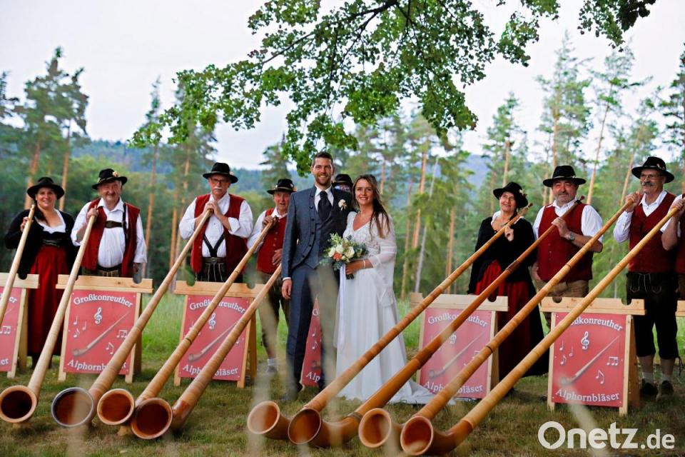 Als besondere Überraschung warteten auf die Hochzeitsgäste auf dem Schusterberg die Großkonreuther Alphornbläser. Akteure der Gruppe kennen das Ehepaar. Und so begleiteten die Musiker erstmals eine Brautentführung. Das imposante Bild der Bläser und Bläserinnen mit ihren langen Alphörnern beeindruckte die Hochzeitsgäste enorm. Die Klänge waren bis nach Friedenfels zu hören. Seit November 2020 wohnt das Paar in Wondreb.