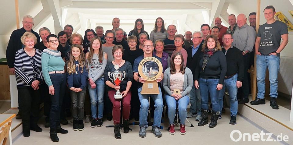 Beate Stock und Rudi Wildenauer (vorne, sitzend von links) sowie Wolfgang Schlicht (Fünfter von rechts) sind die erfolgreichsten Schützen des Nuss- und Nikolausschießens. Vorsitzende Edeltraud Kaßeckert (vorne, Zweite von links) gratuliert den Siegern und den weiteren Platzierten der einzelnen Wettbewerbe.
