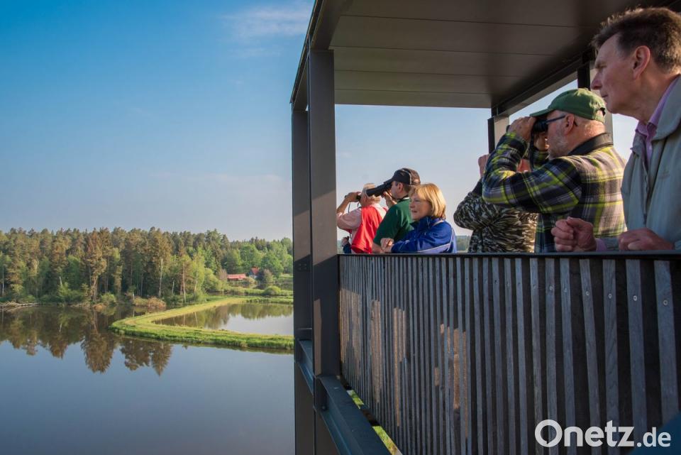 Auch an der "Himmelsleiter" in der Waldnaabaue kamen die Wanderer vorbei. Die prächtige Aussicht über die umliegenden Teiche bescherte viele Erlebnisse. In einem Gebüsch entdeckten die Naturliebhaber einen großen Raubvogel, der Rätsel aufgab. Einige tippten darauf, dass es ein Seeadler war. An einem Altarm der Waldnaab stieg ein Weißstorch hin und her und pickte unablässig ins flache Wasser - das faszinierte alle.