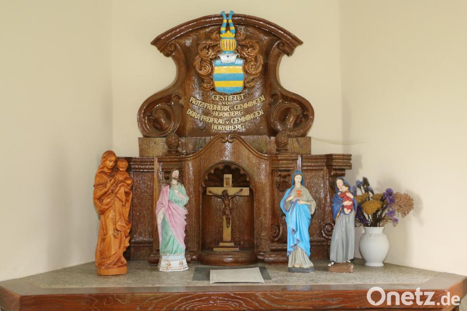 Kleine Spenden und Aufmerksamkeiten für die Kriegerkapelle am Schusterberg gefallen nicht nur der Pfarrgemeinde: Besonders vorbeikommende Wanderer, Spaziergänger und Urlaubsgäste erfreuen sich oft an frischen Blumen und Gestecken an der Kapelle. Erst seit Kurzem steht dort die handgeschnitzte Marienfigur mit Jesuskind (links) von Hans Kellner. Die Kinder des Verstorbenen überließen sie der Kapelle.