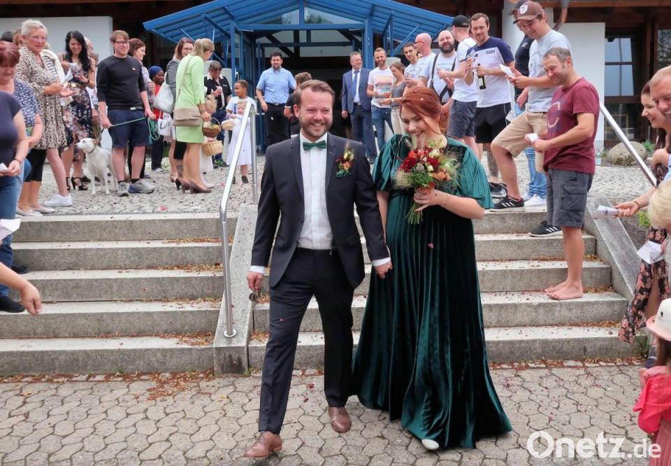 Jennifer Saalfrank und Thomas Trottmann haben am Samstag geheiratet. Nach der standesamtlichen Hochzeit in der Steinwaldhalle in Friedenfels vor Standesbeamtin Regina Wildenauer wartete ein langes Ehrenspalier auf das Paar. Beim Durchschreiten sorgte die Jugendorganisation Stoawaldlerer, wo beide seit langem aktiv sind, für einen Hingucker. Mitglieder der Stoawaldlerer ließen einen bunten Regen aus unzähligen getrockneten Blütenblättern über das Brautpaar niederrieseln. Für Heiterkeit sorgte dabei auch eine Gruppe der „Funny Ladys“ mit kleinen hochprozentigen Abkühlern.