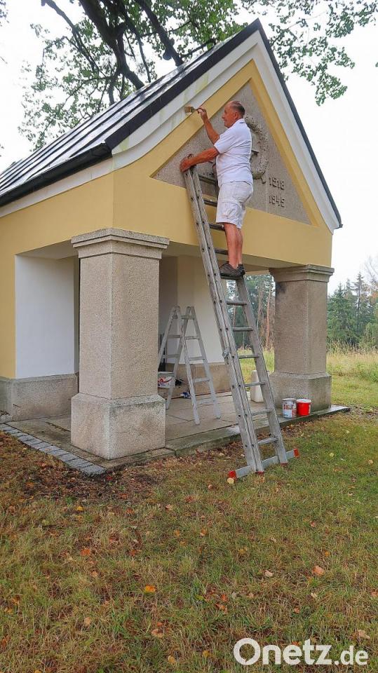 1998 war er zum zweiten Mal an der Renovierung der Kriegerkapelle beteiligt. 2015 hat er nach dem Diebstahl des großen Altarbildes aus der Schusterbergkapelle eine besonders umfangreiche Restauration gestemmt. Denn an der Wand klaffte ein freier Fleck, zum Ärger vieler Gläubiger und vorbeikommender Wanderer. Anfänglich plante Walter Konhäuser damals ein Kreuz zwischen Altar und Decke zu malen. Doch bei seinen Aufenthalten in der Kapelle entdeckte er mehrere Schäden. An den Außenmauern und Granitsäulen waren Moos und Algen zu sehen. Die aufwendige Kassettendecke im Vorraum der Kapelle war morsch, und die Holzdecke in der Kirche brauchte dringend einen Anstrich. Die Steinmauern innen und außen wiesen Flecken und Frostschäden auf. "Mit einem Arbeitseinsatz an einem Nachmittag war es damals nicht getan", erinnert sich Walter Konhäuser.