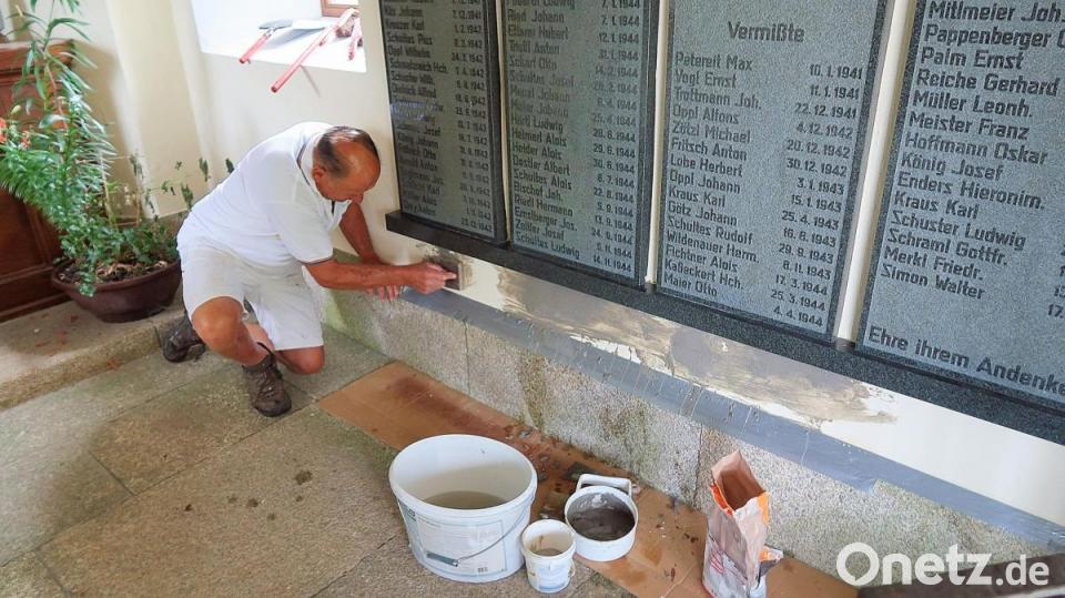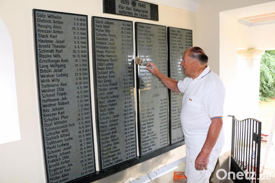 Bei dem neuerlichen Einsatz bekam er Unterstützung von seinem Freund Bernhard Kellner, mit dem er schon mehrere Projekte rund um den Erholungsort durchgeführt hat. "Der Bernd hat mir auch dieses Mal mein gesamtes Werkzeug, Farben, Leitern und die Baumaterialen mit dem Gemeindebus zum Schusterberg transportiert und nach der Fertigstellung wieder abgeholt", lobt Walter Konhäuser. Die zahlreichen Stunden, die er alleine in und an der Kriegerkappelle bei seinen Arbeiten verbringt, genießt er. "Da bin ich mit dem Herrgott alleine und kann über vieles nachdenken". Große Ehrfurcht flößten ihm bei den jüngsten Arbeiten die großen Granittafeln in der Kapelle mit den Namen und der Angabe des Todestages der gefallenen und vermissten Soldaten im Ersten und Zweiten Weltkrieg ein. "54 Namen aus dem Ersten Weltkrieg und 137 aus dem Zweiten Weltkrieg sind darauf verzeichnet. 191 Friedenfelser sinnlos in den Tod getrieben, das muss man sich mal vorstellen", so Walter Konhäuser. Er hat mit einem Pinsel aus jeder Zahl und jedem Buchstaben den Schmutz entfernt. "Diese Arbeiten konnte ich zumindest im Stehen erledigen und musste nicht auf Knien kriechen, wie bei dem zuvor neu aufgebrachten Putz über den Sockelleisten und schadhaften Wänden im Bodenbereich", meint Walter Konhäuser. Und weil er schon mal da war, machte er gleich alle Risse in den Wänden dicht und brachte neue Farben auf - haargenau im gleichen Farbton wie zuletzt. Für den Malermeister war dies kein Problem.