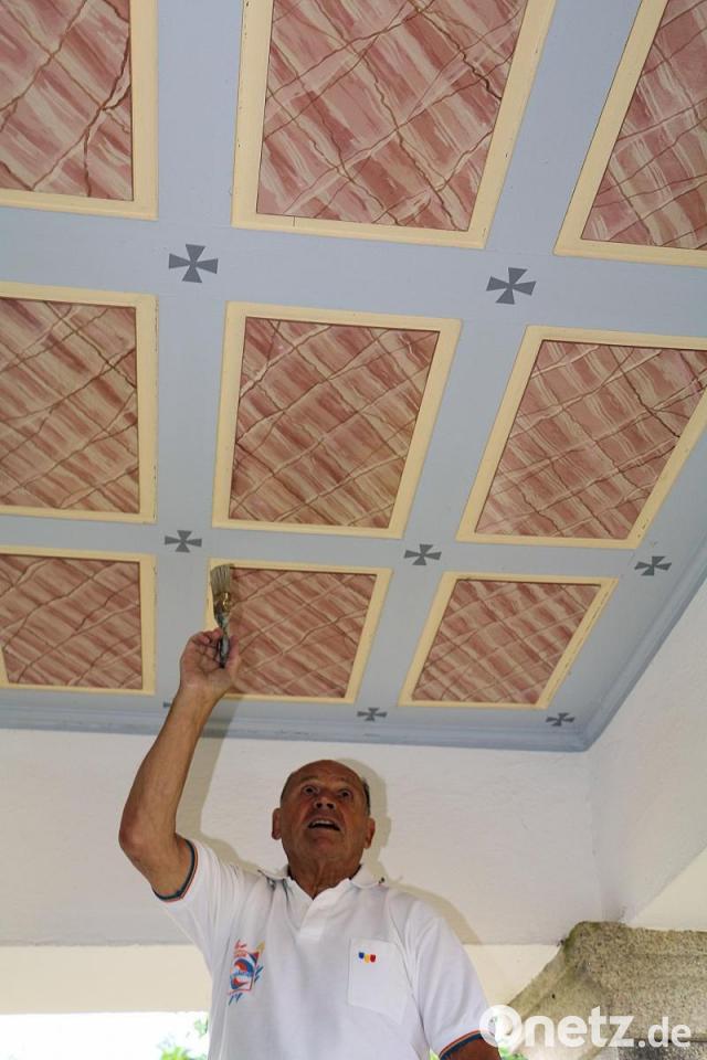 Auch die an der Decke hängende, vom Wetter geschützte prächtigen Kassettendecke im Vorraum der Kapelle hat eine Auffrischung erfahren. Der Anstrich über dem Kopf und auf der Leiter stehend sowie die Arbeiten am First des kleinen Gotteshauses, waren für den mittlerweile 82-jährigen Rentner aber auch kein Problem. "Wenn Gott mir die Kraft gibt und ich gesund bleibe, werde ich hoffentlich auch bei der nächsten Renovierung dabei sein, scherzte Walter Konhäuser zum Abschluss der Arbeiten.