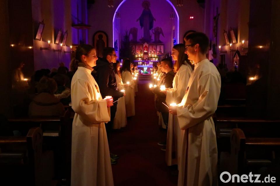 Das Pfarramt hatte bereits im Vorfeld gebeten, Kerzen von zu Hause mitzubringen oder vor dem Gottesdienst zu erwerben. Viele Gläubige tauchten die Pfarrkirche "Maria Immaculata" von Beginn an in ein besonderes Licht. Anstelle der Predigt spielten über 30 Minis die Weihnachtsgeschichte "Die vier Lichter des Hirten Simon" von Gerda Marie Scheidl und Marcus Pfister. Von den Stufen des Altars über die Seitengänge und den großen Mittelgang bis hin zum Haupteingang spielten sich die einzelnen Szenen und Wortwechsel ab.
