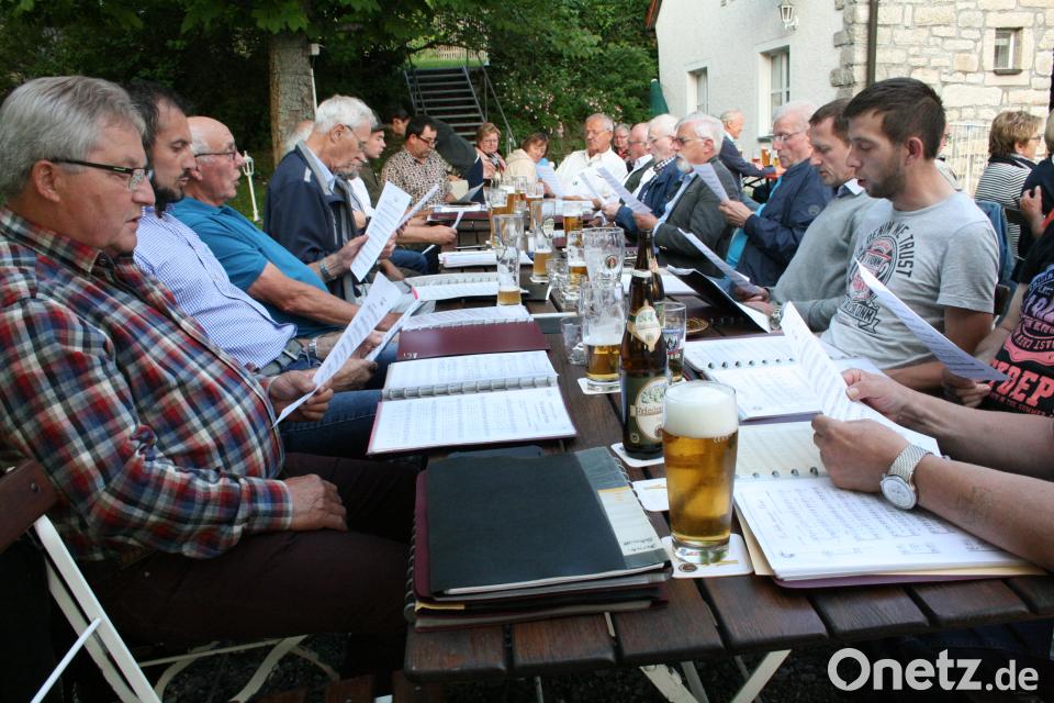 Nach Einbruch der Dämmerung verstärkten bengalische Beleuchtung und der Schein der Windlichter am Tisch die romantische Atmosphäre. Mit „Jenseits des Tales“ ließen die Sängerfreunde die laue Nacht auferstehen. Ein fröhliches Prost „In Vino veritas“ huldigte die Wirtin Carola Mitlmeier für die Schnapsspende. Mit „Diesem Weg auf den Höhen bin ich oft gegangen, Vöglein sangen Lieder“ wurden Empfindungen fürs Wanderglück und das nie zu stillende Verlangen nach dem Thüringer Wald geweckt. Zum Ende ließen die Sänger die „Abendglocken rufen“. Der Chor bekräftigte: „Unser Lied ist nun gesungen“.