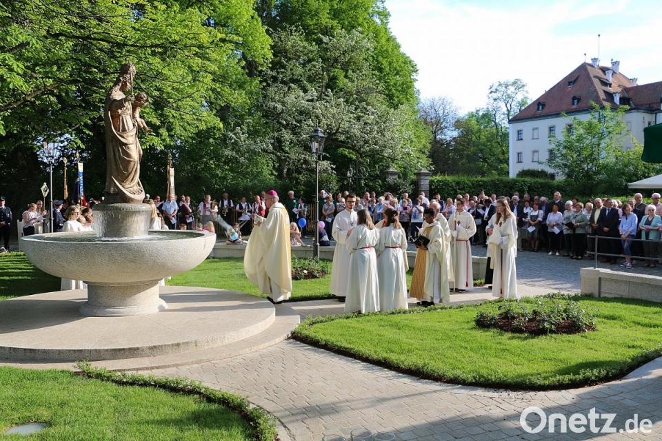 Der Initiator der imposanten Brunnenanlage, Eberhard Freiherr von Gemmingen-Hornberg, hatte die Einweihung mit Pfarrer Joseph vorbereitet und mit dem Pastoralbesuch verbunden. Ein großer Kirchenzug, begleitet von der Musikkapelle Flossenbürg, bewegte sich zur Pfarrkirche. Nach dem feierlichen Pontifikalgottesdienst ging es zurück zum Marienbrunnen. Bischof Voderholzer segnete das neue Schmuckstück mit seiner über zwei Meter großen Skulptur der Patrona Bavariae.