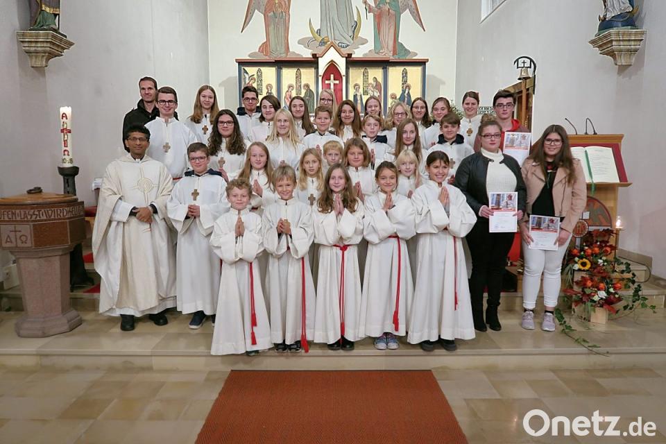 Pfarrer Joseph (links) begrüßte bei einem feierlichen Gottesdienst fünf neue Ministranten in der Pfarrei „Maria Immaculata“. Die drei Mädchen und zwei Buben (vorne) wurden von dem Priester, den restlichen „Lausbuben Gottes“ und Betreuer Carsten Klöble (hinten links) in die Gemeinschaft eingeführt und willkommen geheißen. Mit Erinnerungsurkunden wurden die scheidenden Ministranten (rechts) verabschiedet.