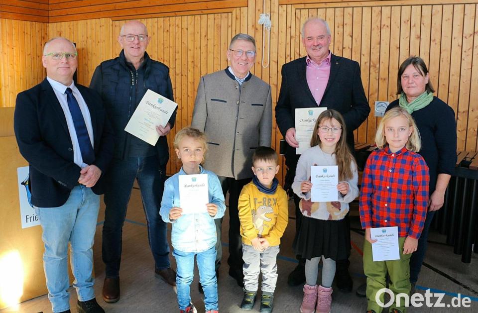 Erstmals waren auch Kinder unter den Gästen, die freiwillige Tätigkeiten zum Wohle der Gemeinschaft verrichtet hatten, wie Bürgermeister Oskar Schuster betonte. Alisa und Amila Rohrer, Karl Arminius und Frieda Carlota Glatte sowie Anna Theresa Weber und Xaver Höcht hatten im vergangenen Jahr an einem gemeindlichen Wettbewerb teilgenommen. Sie schufen kleine Kunstwerke für das neue Rathaus sowie für die Friedenfelser Senioren in den umliegenden Altenheimen. Unter großem Applaus überreichte Oskar Schuster den jungen Preisträgern Gutscheine und Urkunden. Er sagte: „Die Fensterbilder für das Rathaus und eure Bilder und Zeichnungen für unsere Senioren brachten vielen Bürgern eine große Freude.“