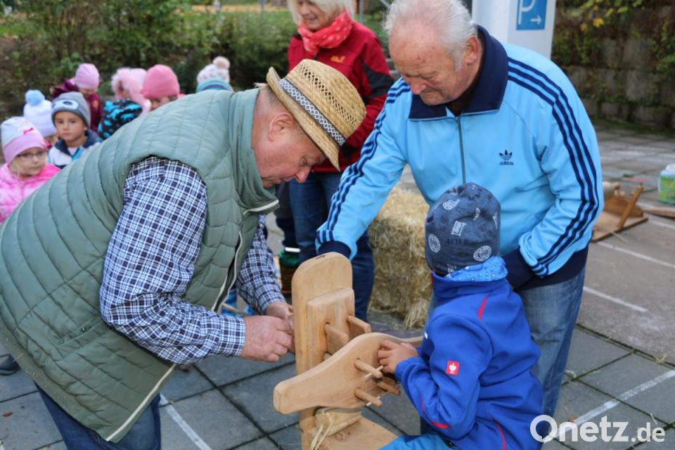 Echte Profis im Bereich alter Handwerkskunst sind Erwin Bächer, Theo Höfer, Bernhard Schaumberger und Josef Wendl. Die spontane Zusage der vier agilen Senioren erfreute das Kindergartenteam. Erwin Bächer und seine Helfer schafften die alten Arbeitsgeräte ins Freigelände des Kindergartens. Am Aktionstag staunten dann die Kleinen nicht schlecht, als sie die ersten Spiel- und Sprungseile erhielten. Noch interessanter, vor allem für die Buben, war die Herstellung der verschieden langen Seile. Die vier Mitglieder des Arbeitskreises Tourismus setzten die Kinder an die alten Vorrichtungen zur Seilherstellung und ließen sie unter ihrer Anleitung verschiedene Stricke und Schnüre fabrizieren.