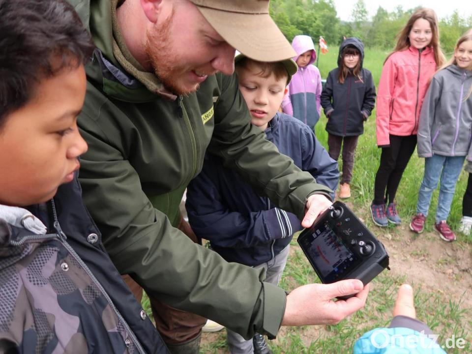Beim anschließenden Auspacken und Zusammenbauen der Drohne drängten sich die Kinder dicht um den Ranger. Da die Wiese demnächst abgemäht werden soll, machte sich Ständer zusammen mit den Schülerinnen und Schülern per Drohne und Steuergerät-Display auf die Suche nach Rehkitzen. Schon bald nach dem Aufsteigen war am Bildschirm ein heller Punkt erkennbar und bei den Kindern setzte Begeisterung ein.