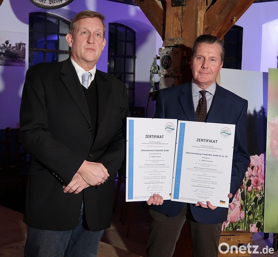 „Unsere Untersuchungen waren eine Freude“, meinte Stefan Dissel vom Deutschen Institut für Nachhaltigkeit und Ökonomie in seiner Laudatio. „Bereits vor drei Jahren waren der Standard und das Level in Ihren Unternehmen sehr hoch. Doch was wir diesmal vorgefunden haben, sprengte unsere Erwartungen.“ Der Geschäftsführer verwies dabei auf den Erfolg mit dem Bio-Mohn sowie die in Planung befindliche Schilfkläranlage. Große Zertifikate waren das sichtbare Zeichen der erfolgreichen umfassenden Nachhaltigkeitsprüfung, die Stefan Dissel unter großem und langem Applaus dem Inhaber der Friedenfelser Betriebe, Eberhard Freiherr von Gemmingen-Hornberg, aushändigte.