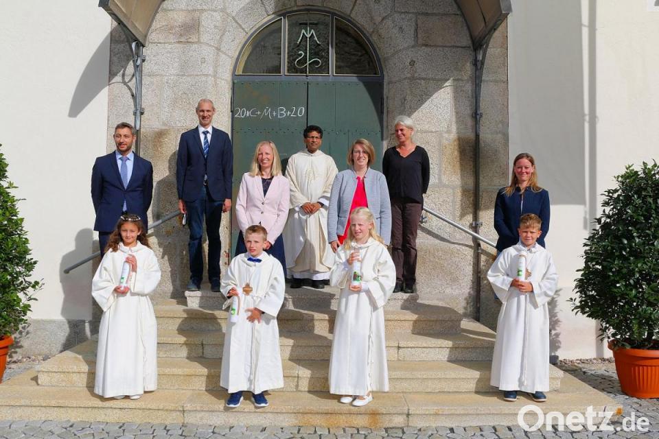 Zwei Mädchen und zwei Jungen der Pfarrei traten am Sonntag in der Pfarrkirche „Maria Immaculata“ erstmals an den Tisch des Herrn. In den vergangenen Jahren hatte die Pfarrei immer um den Weißen Sonntag herum Erstkommunion gefeiert. Nach den Corona-Lockerungen hatte Pfarrer Joseph in Absprache mit den Eltern den Festtag nun auf das zurückliegende Wochenende gelegt. Am Samstag, 3. Oktober, Tag der Deutschen Einheit, wurde die Pfarrkirche herausgeputzt und geschmückt. Von Weitem konnte man schon an den großen Fahnen vor dem Haupteingang sehen, dass ein besonderer Festtag in der Pfarrkirche ansteht. Da jedoch nur eine bestimmte Anzahl von Gläubigen in die Kirche eingelassen werden durfte, war der Gottesdienst nur für die Kommunionkinder und deren Familien bestimmt.