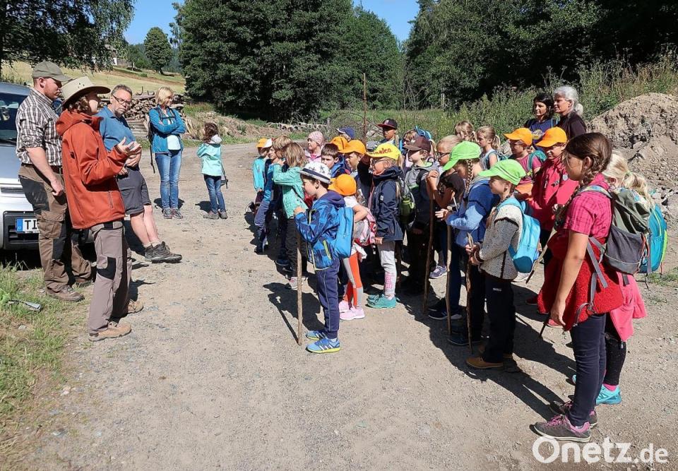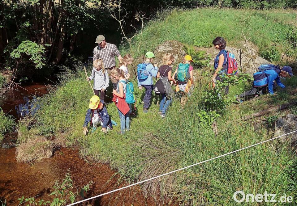 Mit ihren Lehrerinnen Anita Grünbauer, Evi Kern und Claudia Wölke wanderten die Kinder von der Grundschule zur drei Kilometer entfernten Grenzmühle. Dort warteten bereits die beiden Ranger des Naturparks Steinwald, Amelie Nöth und Jonas Ständer, sowie Robert Mertl vom Verein Kulturlandschaft Südlicher Steinwald auf die Kinder. Alle drei verstanden es, die Kleinen für das Thema zu begeistern. Aufgeteilt in Gruppen ging es an verschiedene Stellen des Grenzbachs und auf die angrenzenden Wiesen. Dabei wurden die Materie Wasser und Leben mit ihren Tier- und Fischarten ausgiebig durchleuchtet. Fragen beantworteten die Ranger umgehend. Besonders interessant waren für die Mädchen und Buben die Beobachtungen von Libellen, die vorbeischwirrten, oder das Fangen von kleinen Fröschen.