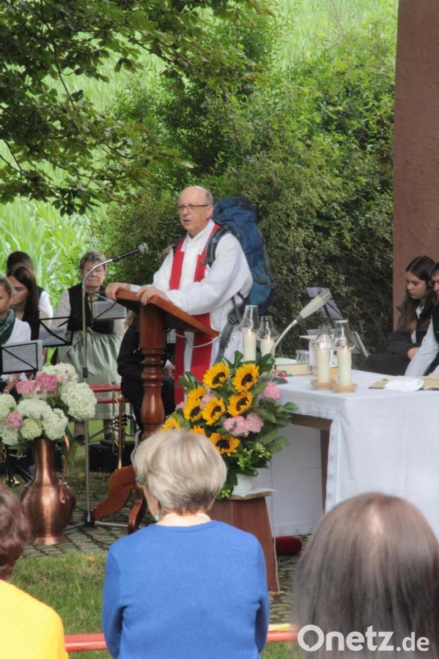 Pfarrer Herbert Rösl stellte den Gottesdienst unter das Motto „Auf dem Weg sein“. In seiner Predigt veranschaulichte er durch das Tragen eines Rucksacks, was für einen Pilger an Ausrüstung mindestens vonnöten ist: Verpflegung, Getränk, Wechselkleidung – also tatsächlich nur das auf das Nötigste Reduzierte. Hier zog er Parallelen zur immer noch allgegenwärtigen Pandemie, die den einzelnen Menschen in seinen Möglichkeiten ebenfalls stark reduziert und einschränkt.
