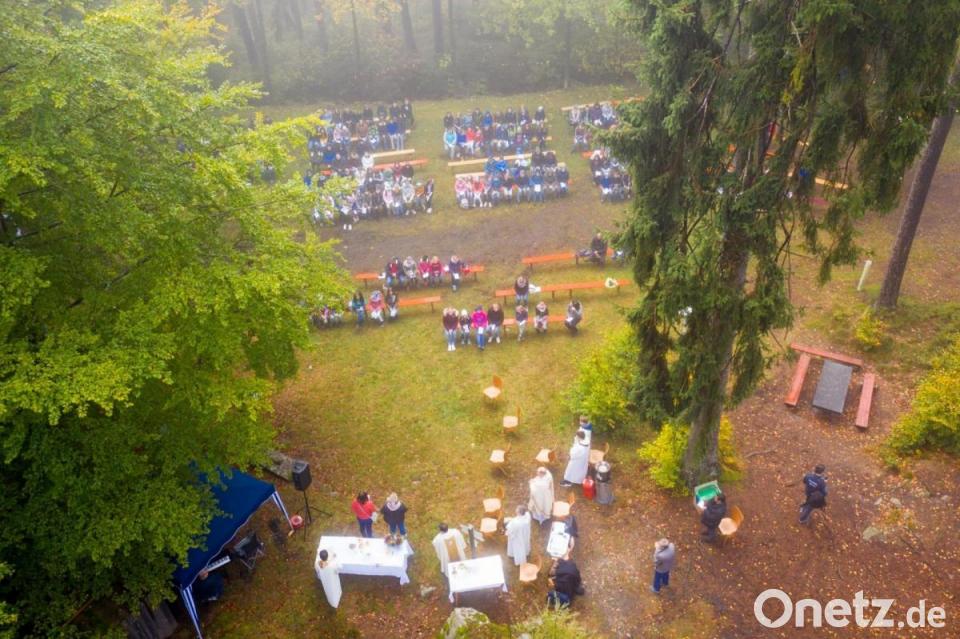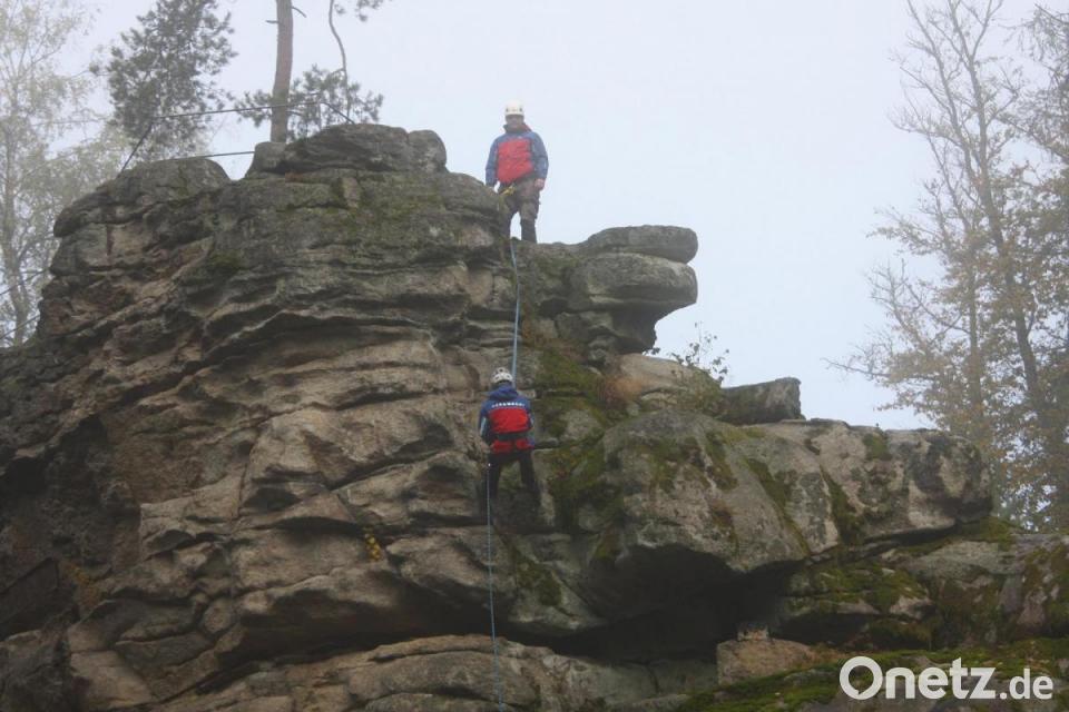 Der Tag begann mit einem Gottesdienst vor der Granitwand des Hackelsteins. Passend dazu hatten sich die Veranstalter auf das Thema „Gipfelstürmer“ verständigt, das dank der Bergwacht Fuchsmühl auch bildlich, in Form eines jungen Bergsteigers, dargestellt wurde. „Er hat sich erfolgreich abgeseilt“, warf Pfarrer Konrad Amschl einen Blick an den Fuß des Hackelsteins, wo vor wenigen Augenblicken der Jugendliche, jetzt auf sicherem Boden stehend, angelangt war. „Der Bergsteiger musste sich anstrengen. Das müsst auch ihr immer wieder“, erinnerte Amschl an den regelmäßigen Dienst der Ministranten. Der Geistliche mahnte: „Bergsteiger halten zusammen, haltet auch ihr zusammen.“