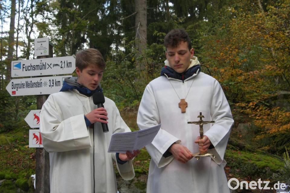In den Steinwald gekommen waren rund 150 Ministranten aus 14 Pfarreien im Landkreis Tirschenreuth und mit Marktredwitz (Sankt Josef) und Wunsiedel (Zu den zwölf Aposteln ) auch 2 Gruppen aus dem benachbarten Oberfranken. Begleitet wurden sie von 20 Betreuern aus den jeweiligen Pfarrgemeinden. Den bereitgelegten Rucksack durften die Fuchsmühler Ministranten Maximilian April und Andreas Trießl auspacken. Zum Vorschein kamen ein Kreuz, Altarschellen, Weihrauchfass und Schiffchen, zudem ein Messbuch und andere Dinge, die in die Fürbitten eingebunden waren. „Jesus ist auch auf einen Berg, aber nicht auf den Hackelstein gestiegen,“ fasste Pfarrer Martin Besold zusammen und betonte: „Mit den Lesungen und den Fürbitten haben wir den Tisch bereitet, um Eucharistie zu feiern.“