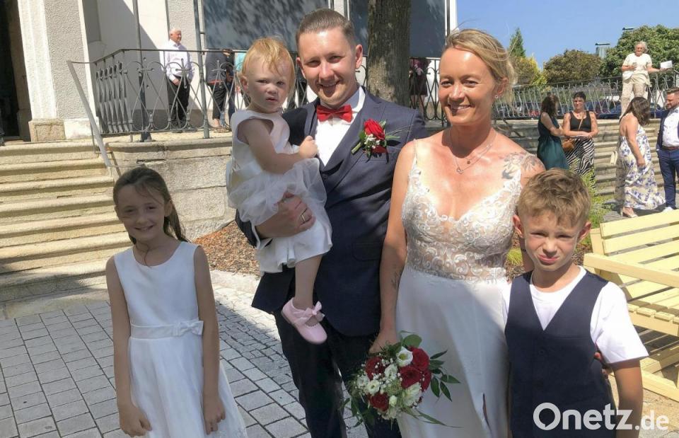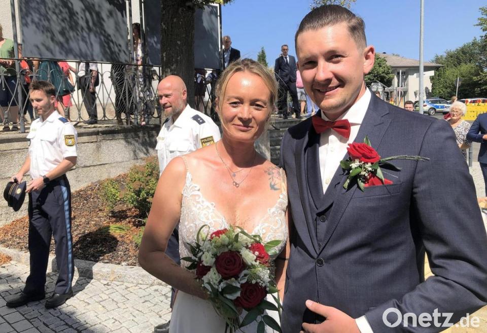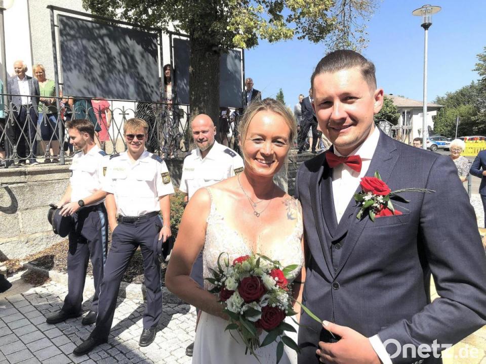 Daniela Mark ist 38 Jahre alt. Sie stammt aus Fuchsmühl und ist gelernte Industriekauffrau. Der 33-jährige Mitterteicher Michael Wedlich ist Polizeibeamter. Deshalb wurde das Paar von einem uniformierten Aufgebot vor der Kirche erwartet und mit einem Spalier überrascht. Wo und wann hat sich das Paar kennengelernt? „Bei Freunden, das war vor drei Jahren“, berichteten die Frischvermählten.