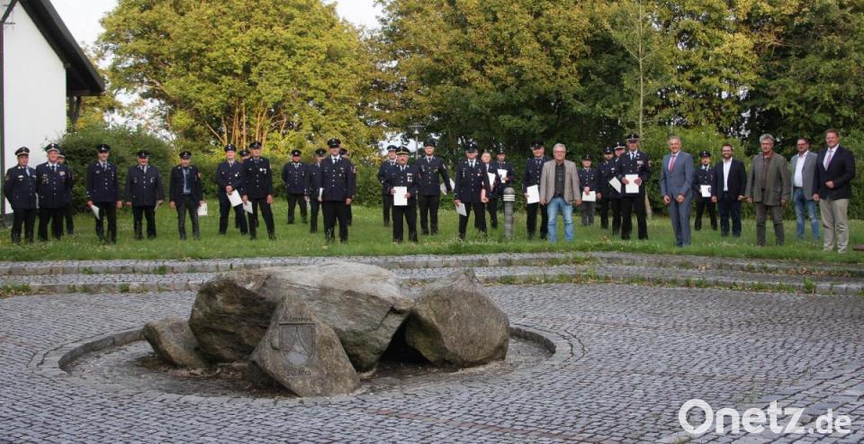 Ehrung für 25 Jahre Dienst: Marko Kreuzer, Tobias Kabat und Thomas Prockl (alle Falkenberg), Bernhard Gleißner, Matthias Zwerenz und Rainer Kellner (alle Fuchsmühl), Achim Nemsow und Thomas Seitz-Hartwich (beide Mitterteich), Stefan Thoma, Michael Schneider und Christian Schön (alle Schönhaid-Leugas), Tobias Trießl, Jörg Trießl, Christian Lang und Michael Eichenseher (alle Voitenthan), Stefan Brandl, Andreas Pinzer und Thorsten Meiler (alle Wiesau).