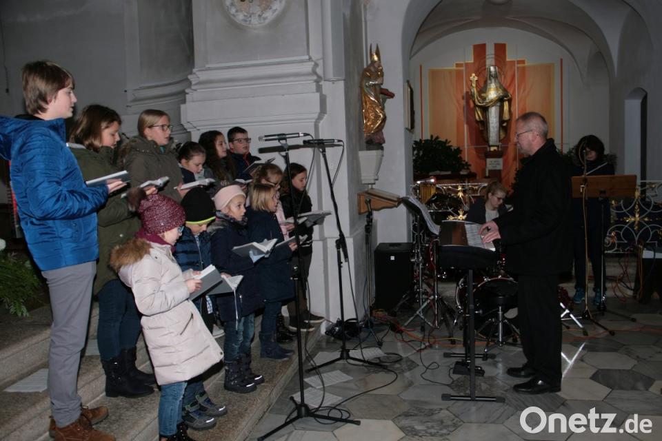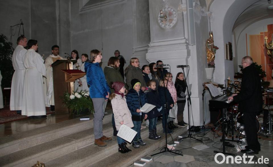 Seit einem Jahr gibt es in der Wallfahrtsgemeinde wieder einen hellstimmigen Kinderchor, der bereits bei einigen Veranstaltungen für Aufmerksamkeit gesorgt hat. Zum Repertoire der 6- bis 15-Jährigen gehören neben weltlich-heiterem Liedgut auch die modernen Lieder im Gotteslob. Offiziell eingeführt im Advent 2013 biete das neue Gesangbuch, in dem auch neues geistliches Liedgut eingebunden wurde, vielfältige Gestaltungsmöglichkeiten, verwies Chorleiter Werner Fritsch auf das Noten-Angebot zum Mitsingen, das er zusammen mit den „Pfarreispatzen“ für die Messe am Christkönigstag ausgesucht hatte. Anklang fand auch die Kombination „Kinderchor und Band“. „Wir wollten die Schätze des Gotteslobes heben“, versprach der Chorleiter. Die Sonntagsmesse hielt Pfarrer Joseph. Typisch für seine Morgenansprache war der gewohnte Dialog – diesmal aber mit den jungen Kirchgängern in den vorderen Bankreihen.