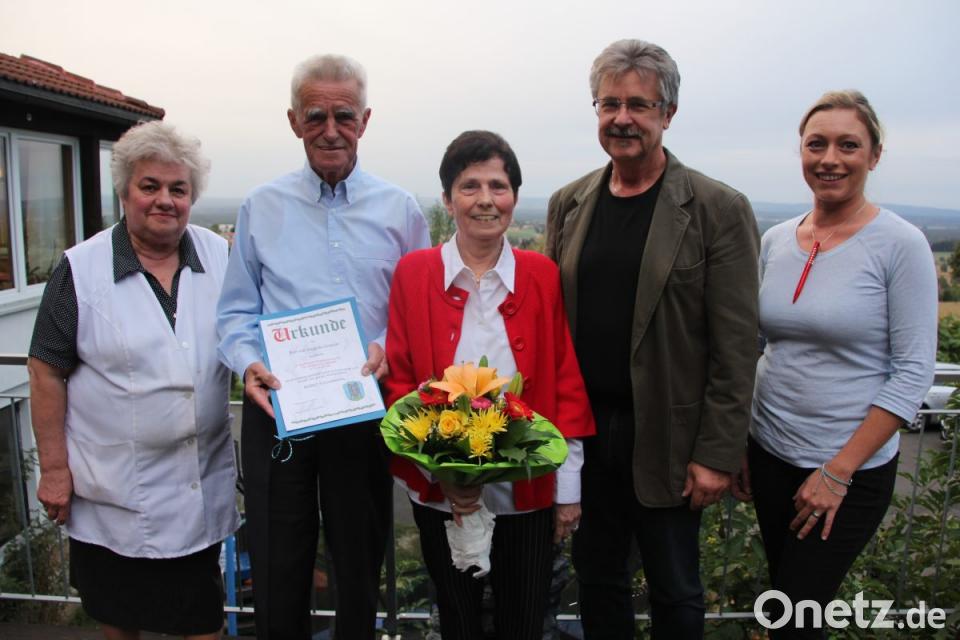 Bürgermeister Wolfgang Braun dankte dem Ehepaar für ihre Treue zu Fuchsmühl und überreichte neben Blumen einen Gutschein. Den Glückwünschen schlossen sich auch Laura und Zorka Ströll vom Hotel "Hackelstein" an.