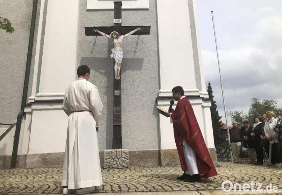 Vor der Segnung erhielt das Missionskreuz einen neuen Farbanstrich. Diese Aufgabe übernahm der Kirchenpfleger und Bürgermeister von Fuchsmühl, Wolfgang Braun. Zusammen mit Helfern erledigte er auch die Gerüstarbeiten, um den Korpus gefahrlos an Ort und Stelle bringen zu können.