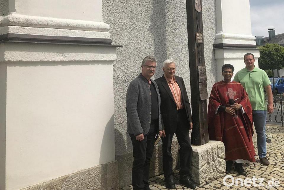 Mit dem Segen Gottes ausgestattet und seiner Bestimmung offiziell übergeben wurde das neugestaltete Gesamtensemble nach dem Sonntagsgottesdienst von Pfarrer Joseph. Diese besondere Spendenübergabe nutzten der Seelsorger, der Kirchenpfleger und die Kirchenverwaltung, um sich beim Gestalter Alfons Schraml persönlich zu bedanken.