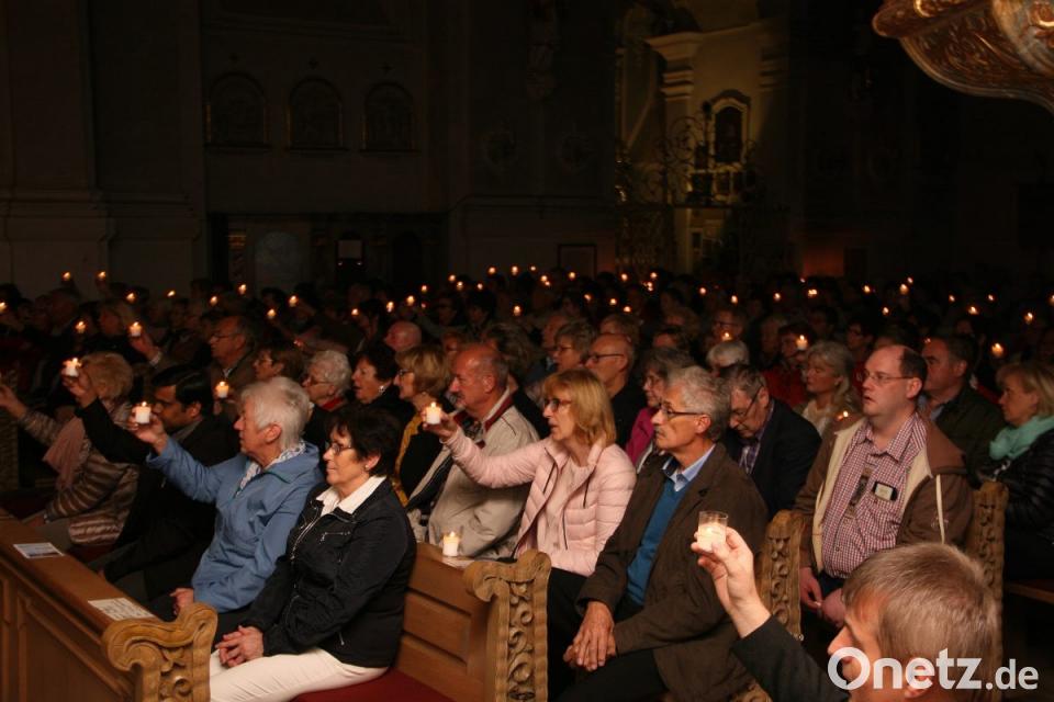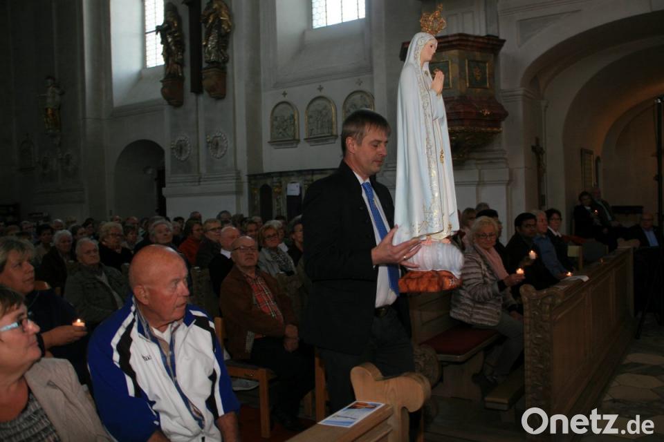 "Diese haben wir aus Fatima mitgebracht", erklärte die Oberpfälzerin, während Ehemann Siegfried das Gnadenbild von seinem vorübergehenden Platz abholte, um es nach vorne zu bringen. Spontan bat die Künstlerin auch um eine Chorprobe mit ihren Fans. Erklärend versprach sie: "Wir wollen später einen gemeinsamen Kanon singen. Lächelnd - an Pfarrer Joseph gewandt - ergänzte die Künstlerin: "Herr Pfarrer, ich verlasse mich auf Sie und ihre Schäfchen." Humorvoll fügte sie hinzu: "Ich glaube, wir kriegen das hin." Sie sollte recht behalten. Regelmäßig ließ der Gast mit der schönen Stimme auch Szenen anklingen, die - passend zum Konzert - an die Marien-Erscheinungen im portugiesischen Wallfahrtsort erinnerten. Traeger ermahnte dazu, die Fatima-Botschaft ernst zu nehmen. Danach folgten Beispiele aus dem Repertoire. Darunter auch Bekanntes aus dem Gotteslob, wie "Maria zu lieben ist allzeit mein Sinn", "Segne du Maria" und abschließend auch "Großer Gott, wir loben dich": Der in die Ohren gehende Melodienreigen regte zum Mitsingen an. Brennende Kerzen wurden an passenden Stellen in die Höhe gehoben.
