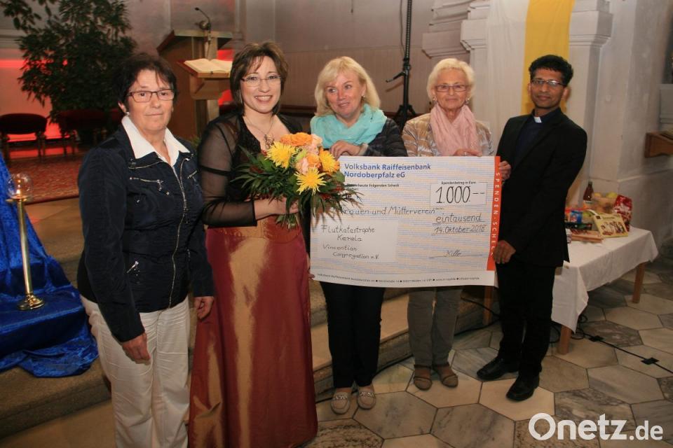 1000 Euro durften Vorsitzende Anna Koller, Marianne Köllner und Franziska Heindl daher an Pfarrer Joseph nach Konzertende übergeben: Es war der Erlös, den der Verein aus den Eintrittsgeldern bereit stellte. Das Geld sei für die von der Flutkatastrophe heimgesuchten Menschen in der Region Kerala in Indien bestimmt, von woher Pfarrer Joseph und Kaplan Martin stammen, fügte das Damen-Trio bei Übergabe des symbolischen Schecks am Ende des Marienkonzertes hinzu.