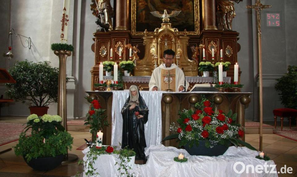 Nicht ausfallen lassen wollte die Pfarrei die gewohnten Gottesdienste sowie die Rita-Andacht am Sonntagnachmittag. Gesegnet wurden die Rita-Rosen, Kerzen und Fläschchen mit Rita-Öl. Angestimmt wurden die ausgewählten Lieder, am Ende des Gottesdiensts auch das Rita-Lied. Nicht nur Pfarrer Joseph, auch die Teilnehmer vermissten die gewohnte Stimmung. "Sicher ist es auch nicht einfach, mit Mundschutz zu singen", bat Pfarrer Joseph um Verständnis.