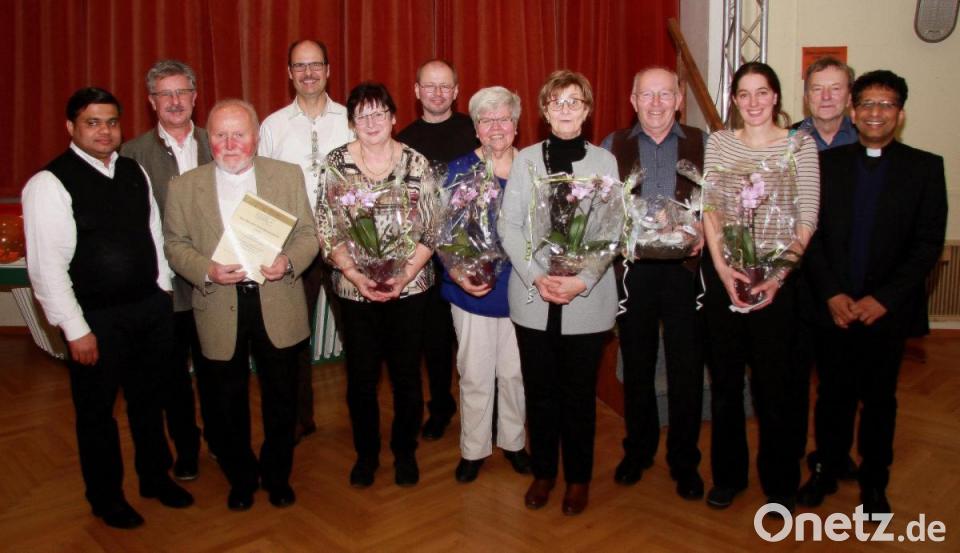 Auszeichnet wurde auch die Sprecherin des Pfarrgemeinderates, Christa Müller, die dem Gremium seit 22 Jahren angehört. "Sie hat uns nie im Stich gelassen. Auf Christa kann man sich immer verlassen." Conny Engelmann, die als Nächste nach vorne gebeten wurde, sei der Motor in der Küche. "Jemand, der stets bereit ist zu helfen." Engelmann organisiert die Pfarrfeste und Ehrenabende in der Pfarrei mit "Geduld und Erfahrung". Als jemanden, der immer zur Stelle sei, um Mesner Siegfried Stock zu unterstützen, bezeichnete Pfarrer Joseph den langjährigen stellvertretenden Mesner und Kommunionhelfer Alois Konz. "Vergelt's Gott auch dir, lieber Alois." Christa Hilgarth und Kathrin Wenzel wurde für die Arbeit beim Schmücken der Wallfahrtskirche gedankt. Zudem kümmert sich Hilgarth um die Pflege der Textilien in der Kirche. Die beiden Frauen seien eine wertvolle Stütze, ergänzte der Seelsorger, um auch ihnen Gottes Segen zu wünschen.