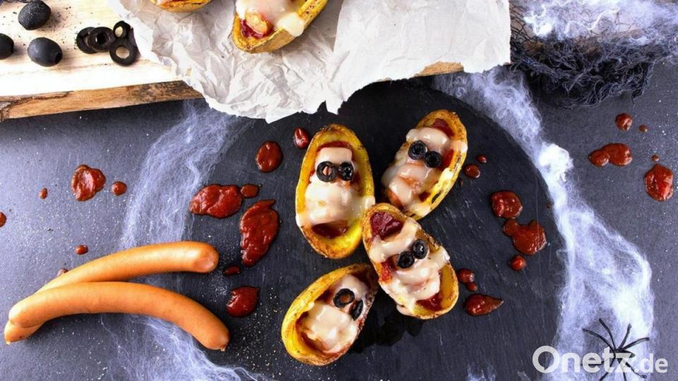 Den Geistern ganz nah sind Halloween-Fans mit knackigen Mumien aus Würstchen, die knusprigen Kartoffel-Särgen entsteigen. Die Zubereitung geht ganz ohne Grauen von der Hand: Dafür einfach Kartoffeln halbieren und aushöhlen, mit einem Gemisch aus Öl, Salz und Pfeffer bestreichen. Nach 15 Minuten im 200 Grad heißen Ofen werden die Mulden in den Kartoffeln mit Tomatensoße ausgestrichen und mit Knackwürsten gefüllt. Käse in schmalen Streifen dient als Verband für die schaurigen Mumien, Olivenringe verleihen ihnen einen leeren Blick. Die Kartoffel-Miniatur-Särge kommen danach wieder in den Ofen, bis der Käse geschmolzen ist.