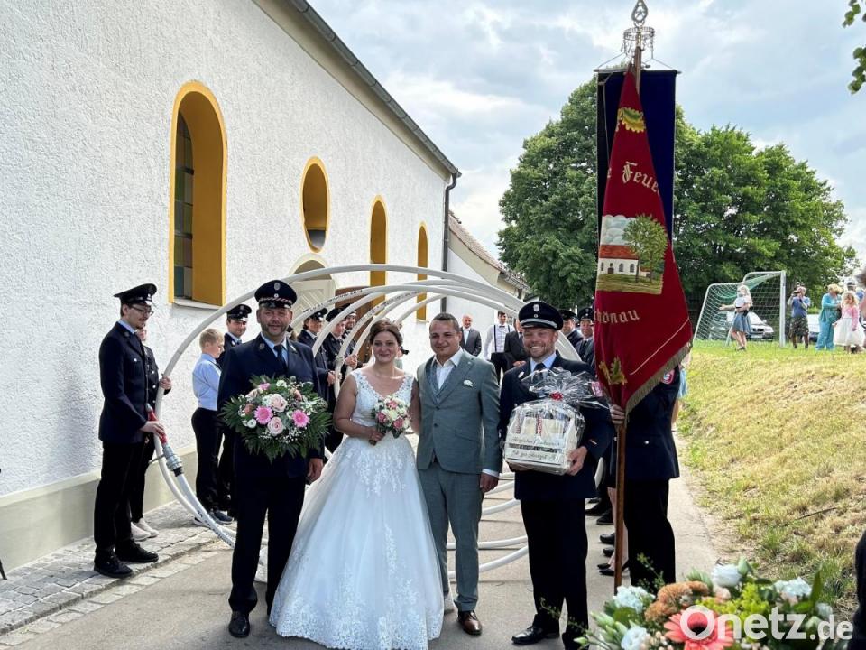 Nach dem Gottesdienst warteten auf den Fahnenjunker der Feuerwehr Schönau etliche Kameraden vor dem Kirchenportal, um die beiden durch eine Schlauchspirale schreiten zu lassen. Am Ende beglückwünschten Vorstand Christian Stangl und Kommandant Marco Bittner die beiden aktiven Feuerwehrler mit einem Blumenstrauß und Präsent. Auch der Jugend-Musikclub aus Schönsee ließ es sich nicht nehmen, den Vereinsmitgliedern die Ehre zu erweisen und sie zu beglückwünschen. Die beiden Vereine lud das Brautpaar ins Gasthaus Häusler nach Hannesried ein, während die Geschwister und Eltern des Brautpaares im Autokorso nach Weiding in den Landgasthof „Zum Frauenstein“ zur Hochzeitsfeier aufbrachen.