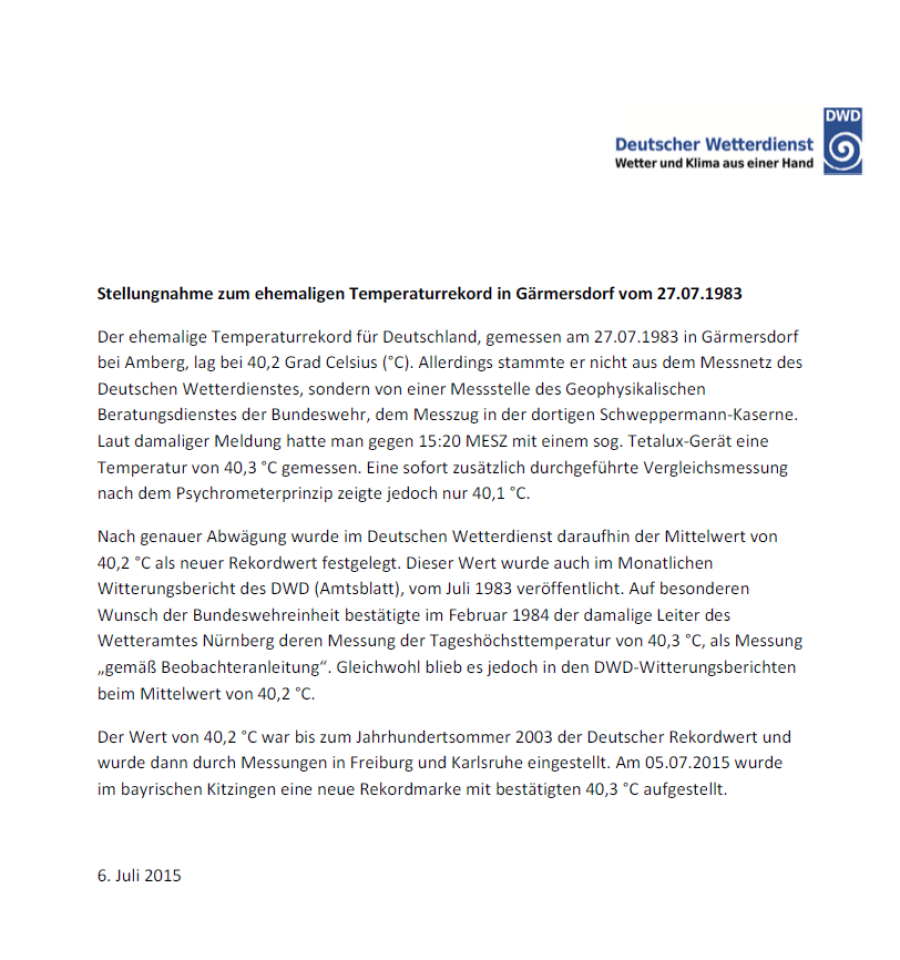 Auch die Gegenmessung mit einem Handgerät bestätigt die Rekordtemperatur. "Das war später wichtig", erzählt Armin Ressel, der damals nicht ahnt, was für ein Papierkram da auf ihn zukommt, bevor er am 7. Februar 1984 endlich die Urkunde mit der offiziellen Anerkennung in Händen hält: 40,3 Grad Celsius, gemessen am 27. Juli 1983 in Gärmersdorf, wo die Schweppermannkaserne beheimatet ist. Unterzeichnet und verbrieft vom Deutschen Wetterdienst, der offiziellen Stelle, die für die Anerkennung von Wetterrekorden zuständig ist.